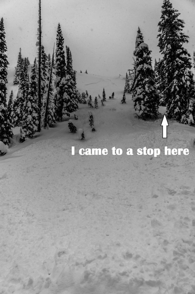 My head was pushed under the snow, I heard my airbag inflate, and I lost sight of the world. With one hand I tried to cover my airway and the other I stretched forward to brace for impact with old growth spruce. Seconds later came relief; I’d come to a stop, unburied in a stand of trees, as the rest of the debris continued for another 80m. Somehow I’d slalomed through the trees without hitting a single one, and came to a gentle stop when the snow piled up into a tree ahead of me. I pushed up out of the snow, began to hyperventilate as the adrenaline wore off, and shouted up to my co-worker Matt that I was okay.
