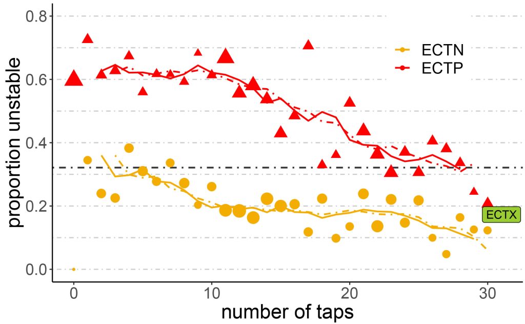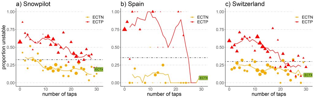 Quite clearly, ECTVs and ECTPs are observed more often on unstable slopes (dark grey line in Fig. 1 located above the base rate, represented by the dashed black line). ECTNs and ECTXs are observed more commonly on stable slopes (light grey line in Fig. 1 located below the base rate). Further, ECTs with a higher number of taps tend to be more stable.