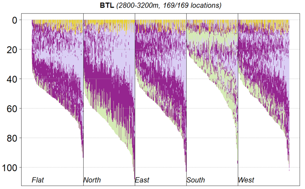 Finally, each cell was assigned to an elevation band (e.g., below treeline, treeline, alpine) based on the typical treeline elevation in that region. Treeline was derived from the land cover dataset by identifying the highest elevation where forested terrain is present.