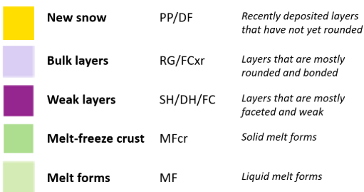 | – Regional patterns: The model has a unique ability to reveal broad spatial trends and cluster similar snowpack conditions across mountain ranges, helping you see beyond local point-scale observations. – Elevation and aspect trends: Profiles for a region show general trends in how the snowpack changes across elevation bands and aspects. – Tracking new snow and settlement: In many regions, the model reliably tracks recent snowfall, timing, and settlement. This is especially useful during multi-day storms or when returning to an area after time away. – Visualizing key layers: Viewing simulated depths of weak layers and crusts helps build a mental model of the snowpack structure, which can be difficult to infer from sparse field observations. – Early-season: When field data are limited or missing, the model helps fill observational gaps and gives a sense of how the snowpack is developing. For example, are there early-season rain crusts and are they faceting? – Monitoring problem evolution: By showing how layers change over time, the dashboard can hint when persistent weak layers or other problems are beginning to stabilize. | – Time of day matters: Forecasts reflect afternoon conditions (0 UTC or 4/5 PM Pacific) and update in 24-hour steps. Keep this in mind for processes with finer timing, such as overnight surface hoar growth, afternoon melt, or daytime snowfall. – Data-gaps happen: Check timestamps and watch for error messages—delays in ECCC weather data or occasional model bugs can result in outdated information and misleading results. – Precipitation is the biggest source of error: Issues with timing, type, or amount of precipitation can throw off snowpack evolution and hazard metrics. Use precipitation maps and historic profile timelines to judge if patterns seem reasonable. – Climate affects error sensitivity: In maritime climates, precipitation errors tend to stretch or compress the snowpack, but preserve structural features. In continental climates, they can more drastically affect temperature gradients and snowpack structure. – Persistent weak layers are tricky: Their formation is highly sensitive to atmospheric conditions. Rather than focusing on a single point, examine regional patterns to see if past conditions favoured weak layer formation, then consider the modelled amount of snow above the layer, which strongly influences the stability predictions. – Wind slabs are poorly resolved: The simulated stratigraphy does not capture wind stripping or deposition. Additionally, the wind slab hazard metric is unvalidated and intended only to indicate where and when new wind slabs may be forming—not their size or likelihood. |
