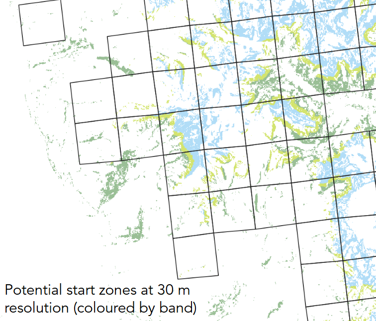 The first step was to identify where avalanches could actually start. We used three high-resolution datasets at 30 m resolution: a digital elevation model (ALOS) to identify slopes between 30–60°, land cover data (NALCMS) to identify open terrain, and PRISM climate data to identify regions with more than 200 mm of annual snowfall. Any 30 × 30 m pixel that met these criteria was treated as a potential start zone. HRDPS grid cells that did not contain any potential start zones were excluded from the model.