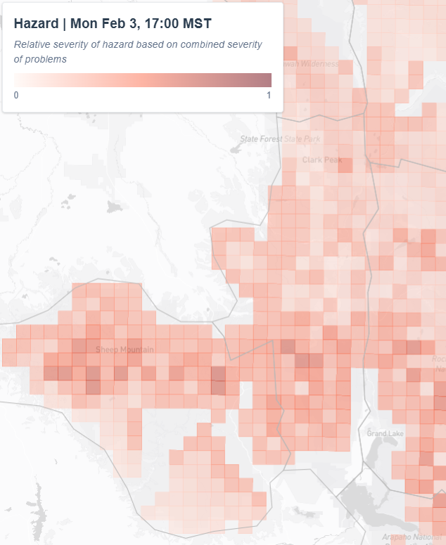 avalanches. An overall hazard score is then created by averaging the two most severe problems. These metrics are intended as broad signals of hazard trends, not exact predictions. Research at SARP is underway to refine and improve these methods.