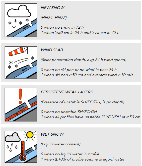 The model chain summarizes thousands of simulated snow profiles with a few key hazard metrics. These are based on four simplified avalanche problem types from the European Avalanche Warning Service: new snow, wind slab, persistent weak layer, and wet snow. Unlike the familiar North American problems—focused on risk management and harder to quantify—these categories tie directly to the physical processes modelled in SNOWPACK. For each problem, the model extracts relevant snowpack and weather variables and translates them into a severity score from 0 to 1—where 0 means the problem is unlikely and 1 means the problem has very likely widespread, large
