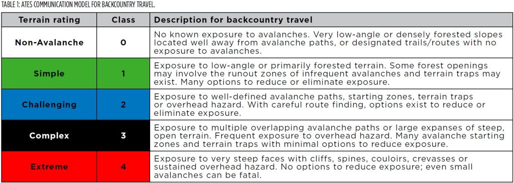 The communication models describe terrain ratings in the language of the receiver. They are light on technical detail and prioritize comprehension. ATES v.2 contains two communication models, each for activities with distinct exposure characteristics: backcountry travel (Table 1) and waterfall ice climbing (Table 2). The models describe and rank avalanche terrain in a simple way, similar to how the danger scale describes and ranks avalanche danger. They represent the summary of a technical assessment intended for avalanche risk communication to less-experienced users.